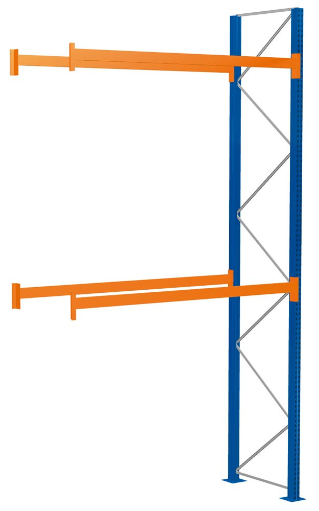 Palettenregal, Anbaufeld, BxTxH 2786x2200x5000 mm, 3 Lagerebenen, Fachlast 1500 kg, Feldlast 4582 kg, Rahmen blau, Holme reinorange