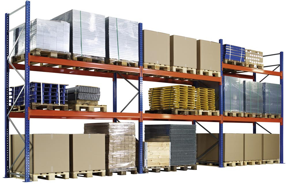 Palettenregal-Set, BxTxH 8444x1100x4000 mm, 3 Lagerebenen, Fachlast 2400 kg, Feldlast 5287 kg, Rahmen blau, Holme reinorange