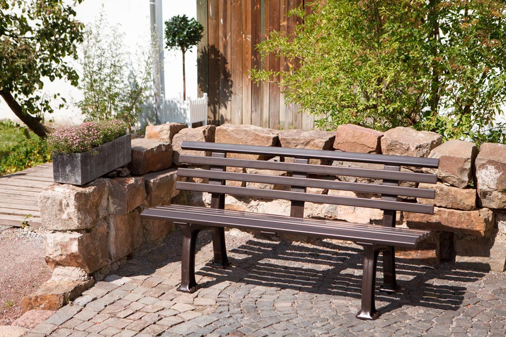 Parkbank aus Kunststoff, mit 2 Füßen, 5 Sitz- und 4 Lehnlatten 50x30 mm, Breite 1500 mm, braun