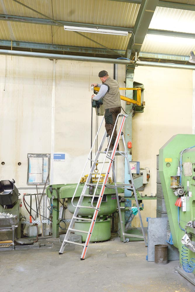 · Große Ablageschale (B 450 mm) für Werkzeug und Kleinteile mit seitlichem Einhängehaken · Große Plattform 440 x 400 mm · Stufentiefe 80 mm · Trittflächen mit R13-Belag · Geländerteil 800 mm hoch · Serienmäßig angebrachte Streben gewährleisten eine hohe Standsicherheit der Leiter · Ausgestattet mit Rollen am Stützteil, Ø 100 mm · Speziell für Einsatzbereiche entwickelt, die ein dichtes Heranfahren der Leiter an Regale erfordern ∙ Stabile Aussteifungsstreben am Antritt · Stabiler Stand durch konische Ausführung · Zulässige Belastung 150 kg · Entspricht EN 131