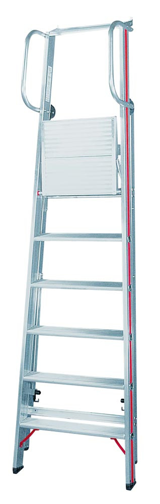 · Geräumige Ablageschale (B: 450 mm) für Werkzeug und Kleinteile mit seitlichem Einhängehaken · Große Plattform 440 x 400 mm · Stufentiefe 80 mm · Geländerteil 800 mm hoch mit beidseitigem Seitenschutz für den sicheren Stand · Serienmäßig angebrachte Streben gewährleisten eine hohe Standsicherheit der Leiter · Auf Wunsch kann die Leiter mit selbsttätig blockierenden Federrollen ausgestattett werden (optionales Zubehör) ∙ Stabile Aussteifungsstreben am Antritt · Stabiler Stand durch konische Ausführung · Zulässige Belastung 150 kg · Entspricht EN 131
