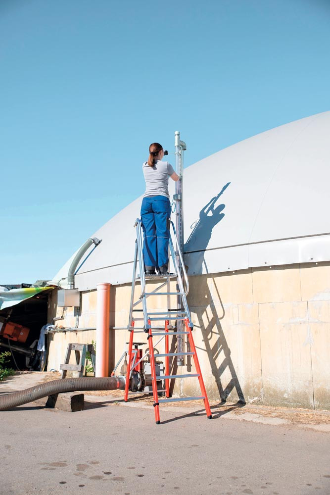 · Aus Aluminium · Stabile Rechteckrohr-Holme · Große Plattform (B x L 400/360 x 425 mm) · Geriffelte Stufen, 80 mm tief · Gebördelte Stufen-/Holmverbindung · Ablageschale · Spreizsicherung durch zwei hochfeste Polyestergurte · Felxible Erweiterung mit optionalen Einsteckteilen die durch Steckverbindungen mit Hakenverriegelung montiert werden · Stufenabstand 235 mm · Leiterneigung 70° · 150 kg maimale Belastung