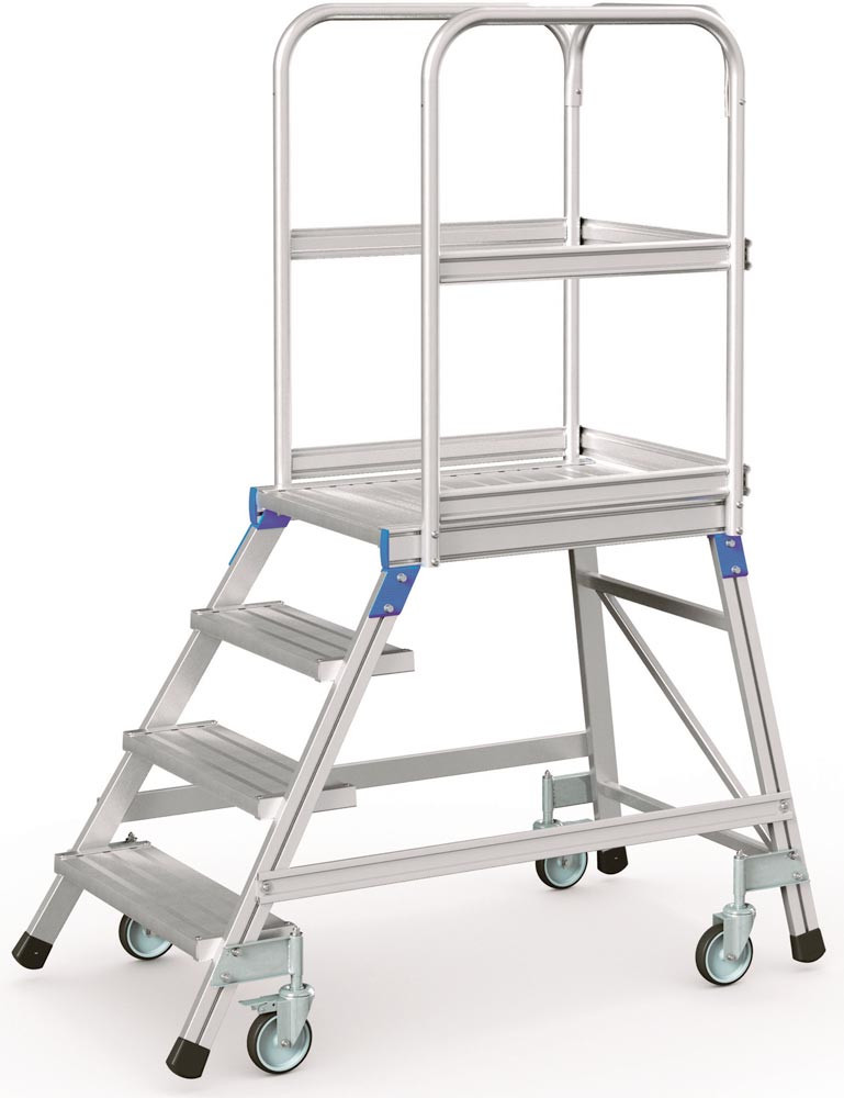 · Mit großem Sicherheitspodest 600 x 800 mm · Dreiseitiges Plattformgeländer, 1000 mm hoch, für maximale Sicherheit · Einseitig begehbar · Bequemer Aufstieg durch 200 mm tiefe Stufen · 4 Federrollen, Ø 125 mm, die beim Besteigen selbsttätig bremsen · 2 Federrollen mit Feststeller zur Sicherung gegen Wegrollen im nicht belasteten Zustand · Belastbarkeit max. 150 kg · Entspricht EN 131-7