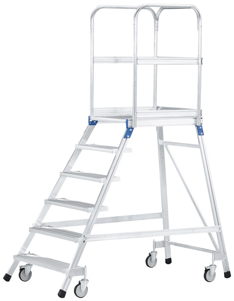 · Mit großem Sicherheitspodest 600 x 800 mm · Dreiseitiges Plattformgeländer, 1000 mm hoch, für maximale Sicherheit · Einseitig begehbar · Bequemer Aufstieg durch 200 mm tiefe Stufen · 4 Federrollen, Ø 125 mm, die beim Besteigen selbsttätig bremsen · 2 Federrollen mit Feststeller zur Sicherung gegen Wegrollen im nicht belasteten Zustand · Belastbarkeit max. 150 kg · Entspricht EN 131-7