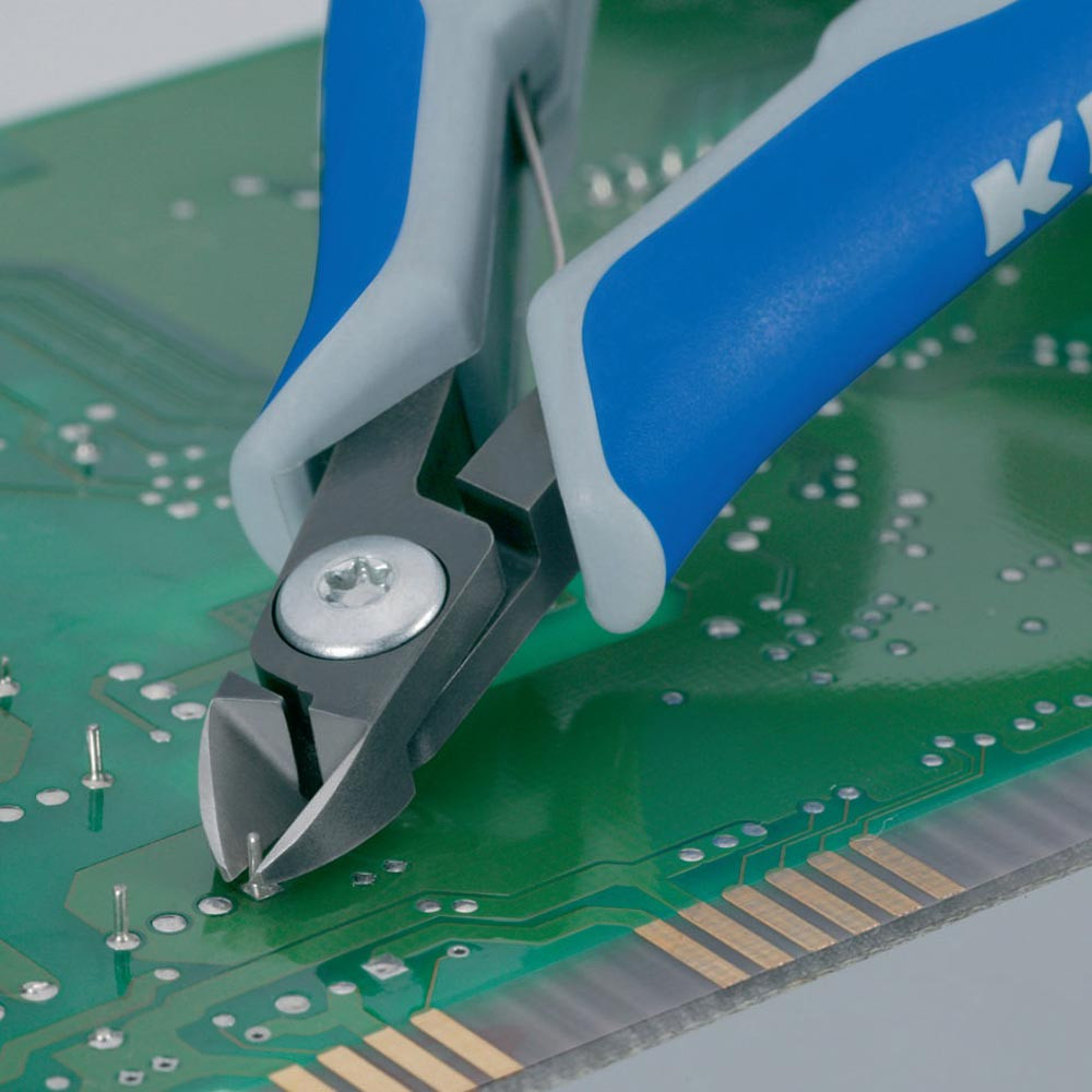 für feinste Schneidarbeiten z. B. in Elektronik und Feinmechanik · geschliffene, scharfe Schneiden · Schneiden zusätzlich induktiv gehärtet, Schneidenhärte ca. min. 64 HRC · ca. 20% weniger Gewicht · geschraubtes Gelenk · Öffnungsfeder · Chrom-Vanadin-Kugellagerstahl, geschmiedet, mehrstufig ölgehärtet