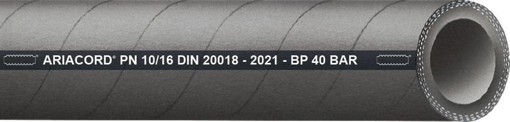 Pressluft-/Wasserschlauch · Aufdruck: Ariacord® PN 10/16 DIN 20018 - Jahr - BP 40 bar · Bemerkung: Abmessungen 38, 51 und 76 sind in der DIN 20018 nicht enthalten · Farbe Innenseele: Schwarz · Fertigungsart Innenseele: Glatt · Fertigungsweise Aussendecke: Gewickelt