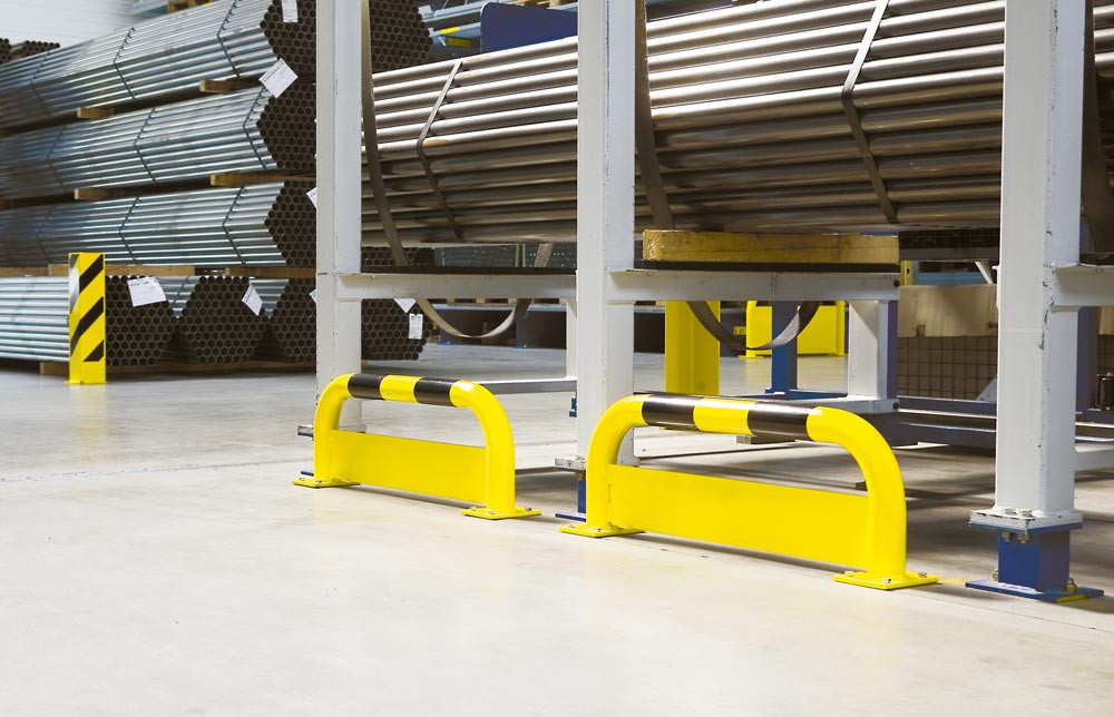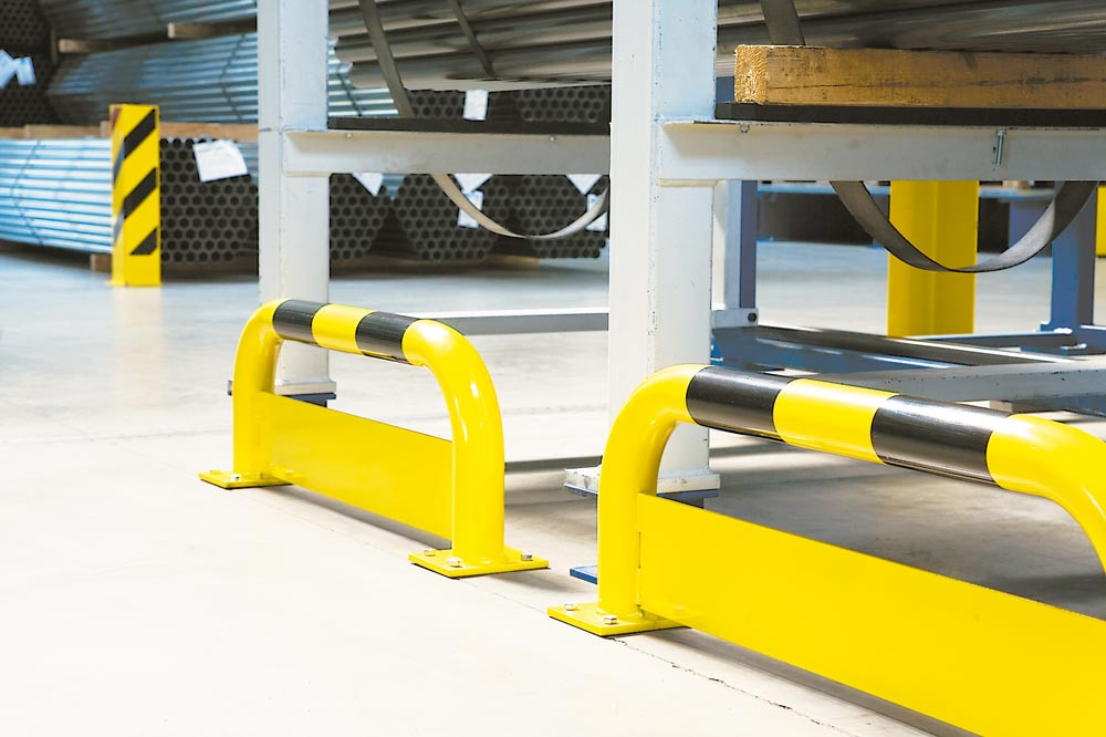∙ Aus hochbelastbarem Gütestahl ∙ Rohrdurchmesser 76 mm ∙ Wandstärke 3 mm ∙ Bodenplatte 160 x 140 x 10 mm · Mit Unterfahrschutz (4 mm stark) ∙ Schützt Ihre Regale vor dem Einfädeln von Staplergabeln und anderen Flur-Fördergeräten