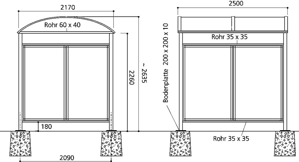 ∙ #7;Unterstände aus Vierkantrohr, Pfosten aus Stahl 80 x 80 mm,