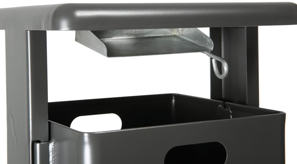 ∙ Stahlblech feuerverzinkt ∙ Eingrifföffnung zum besseren Handling ∙ Abgerundete Haube aus 3 mm Stahlblech ∙ Dreikantschloss geschützt im Ständer integriert ∙ Behälter zum Entleeren schwenk- und abnehmbar ∙ Mit gelochtem Boden für den Wasserablauf ∙ Behältervolumen 40 Liter