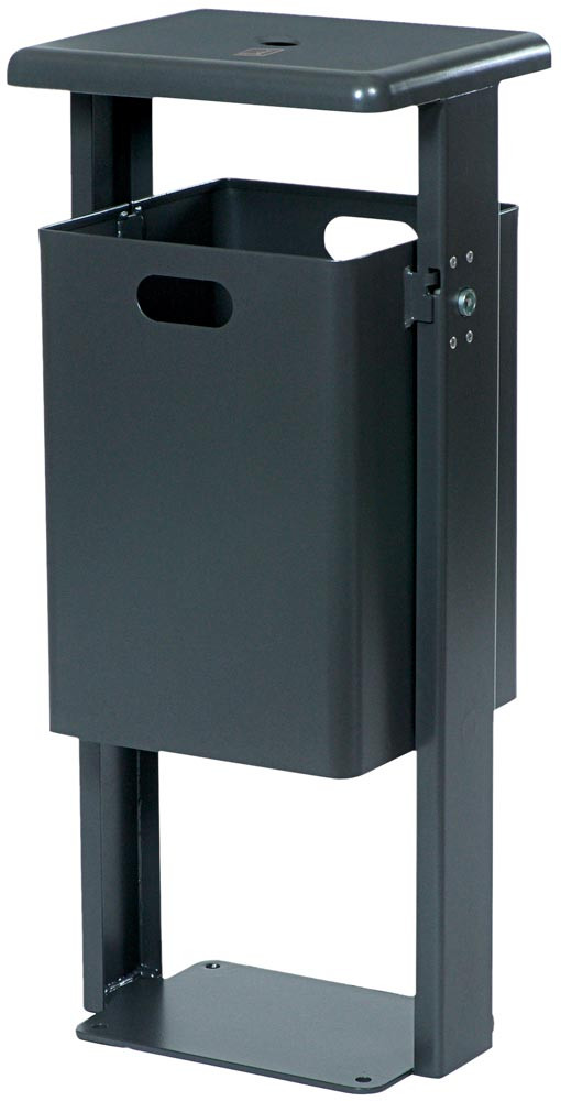 ∙ Stahlblech feuerverzinkt ∙ Eingrifföffnung zum besseren Handling ∙ Abgerundete Haube aus 3 mm Stahlblech ∙ Dreikantschloss geschützt im Ständer integriert ∙ Behälter zum Entleeren schwenk- und abnehmbar ∙ Mit gelochtem Boden für den Wasserablauf ∙ Behältervolumen 40 Liter