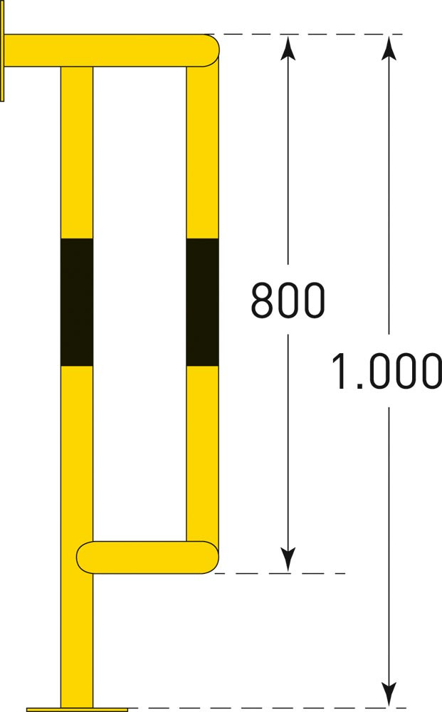 · Gütestahlbügel in halbrunder Bauform · Rohrdurchmesser 48 mm · Wandstärke 2 mm · Schützt Rohre, Leitungen, Kabelschächte etc. gegen Anfahrschäden · Zum Auf- und Andübeln durch je zwei Boden- und Wandplatten (150 x 150 x 5 mm) · Oberfläche feuerverzinkt und gelb beschichtet mit schwarzen Streifen