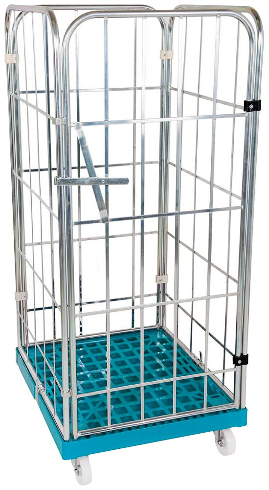∙ 2 Seitenwände, 1 Rückwand und 1 Tür, galvanisch blau verzinkt ∙ Robuste Rohrkonstruktion Ø 22 mm ∙ Ausfachungen mit 4 senkrechten und 4 bzw. 5 waagerechten Flacheisen 12 x 3 mm ∙ Bodenplatte mit 2 Lenk- und 2 Bockrollen Ø 108 mm aus Polypropylen mit Fadenschutz und verschraubter Radachse