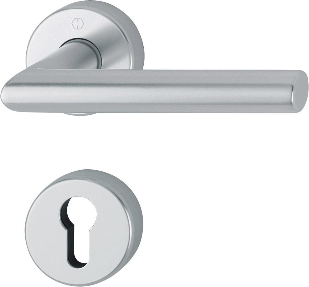 HOPPE-Aluminium-Rosetten-Türgriff-Garnitur mit Schlüsselrosetten für Innentüren: geprüft nach DIN EN 1906: 47-0150A und PIVCERT Plus (1.000.000 Prüfzyklen) · Objekt-Garnitur Lagerung: Türgriffe fest/drehbar · Rückholfedern · HOPPE-Steckgriff-Verbindung mit Kugel-Arretierung Sertos ® · wartungsfreie Gleitlager Verbindung: HOPPE-Profilvollstift · gehärtet Unterkonstruktion: Griffrosetten Stahl · Schlüsselrosetten Kunststoff · Stütznocken Befestigung: verdeckt · durchgehend · Griffrosetten Gewindeschrauben M5 · Schlüsselrosetten Mehrzweckschrauben · wechselseitig