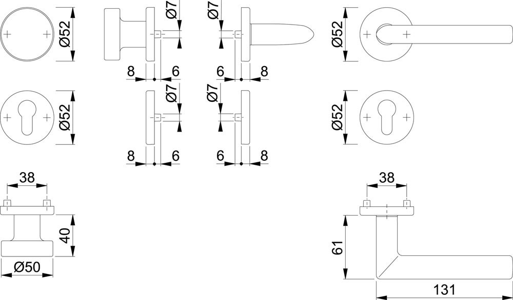 Innentür-Rosetten-Garnitur geprüft nach DIN EN 1906 (Gebrauchs-Kategorie Klasse 3) · Türgriffe mit Schnellstift-Verbindung (mit 8 mm Vollstift) für Türstärke 37-42 mm und Rückholfeder · Rosetten mit Stütznocken unsichtbar verschraubt · Drückerlänge bei Aluminium 132 mm, bei Edelstahl 131 mm · Anschlagrichtung DIN links / rechts
