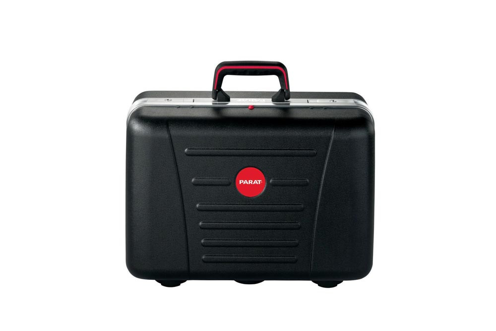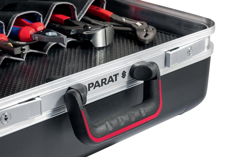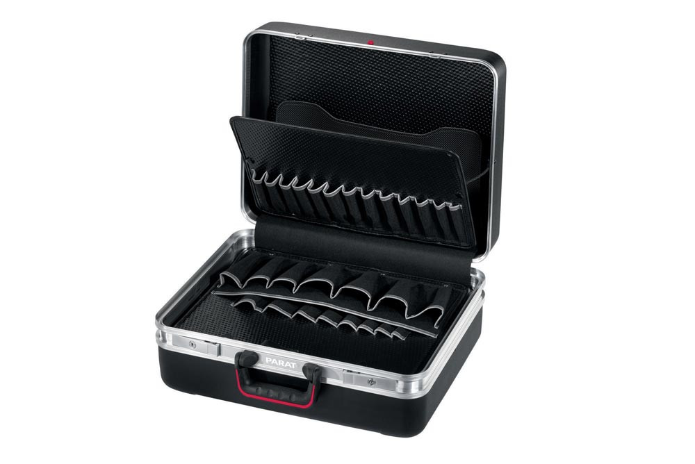 Kofferschalen aus schlagfestem X-ABS-Kunststoff · schwarz · extrem schlagzäh · Doppel-Aluminiumrahmen · gepolsterte Griffmulden · abschließbare Kippzylinderschlösser · Rastscharniere mit Arretierung · Bodengleiter · Tragfähigkeit bis 30 kg · Ausstattung: 1 Werkzeugtafel mit 25 Einsteckfächern, 1 Klemmfach 400 mm · 1 Abdeckplatte mit 15 Einsteckfächern, 1 Klemmfach 400 mm · 1 Bodenschale, Höhe 88 mm, frei unterteilbar, Dokumentenfach im Deckel