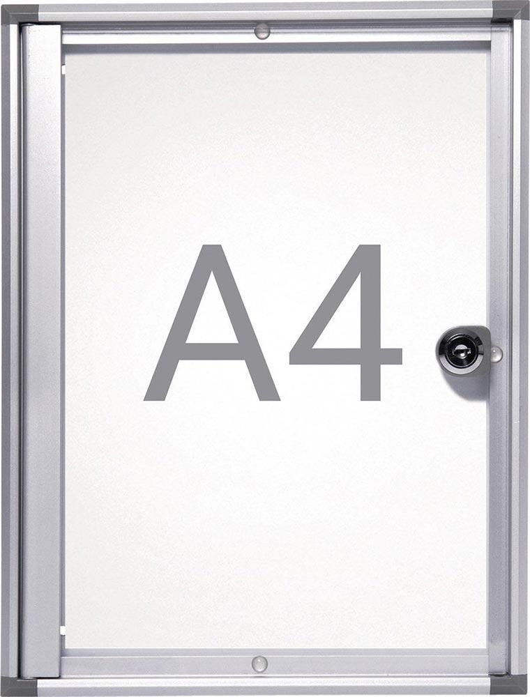 · Einseitiger Schaukasten zur Wandmontage · Bautiefe 31 mm · Innentiefe 9 mm · Rahmen aus silbereloxiertem Aluminiumprofil · Abgeschrägte Eckverbindungen aus Kunststoff · Rahmenlose Flügeltür aus Kunststoffglas mit integriertem Schloss, ab Format 9 x A4 mit 2 Schlössern · Abschließbar, inkl. 2 Schlüsseln · Rückwand aus grau beschichtetem Stahlblech · Magnethaftend · Beschrift- und trocken abwischbar