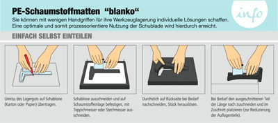 Die PE-Schaumstoffeinlagen "blanko" können Sie individuell an Ihre Bedürfnisse anpassen. Lagern Sie Ihr Werkzeug und Ihre Lagergüter schonend und ordentlich in Ihren Schubladen. Auf den ersten Blick lassen sich fehlende Teile feststellen. Als Unterlage bietet sich unsere blaue Kunststoffunterlage mit 3 mm Stärke an.