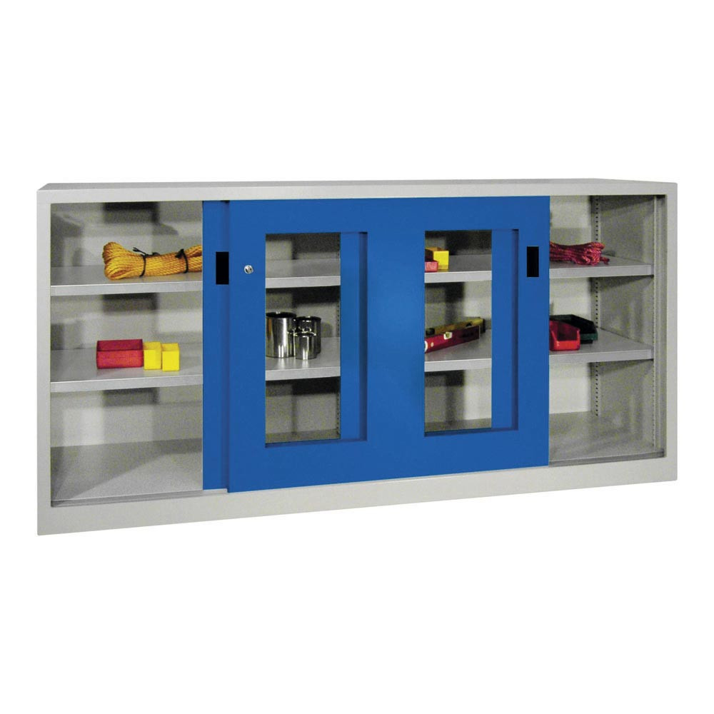 Schiebetürenschrank, Sichtfenstertüren, 2 verzinkte Böden, ohne Trennwand, BxTxH 1000x400x1000 mm, RAL 7035/5010 EP525585