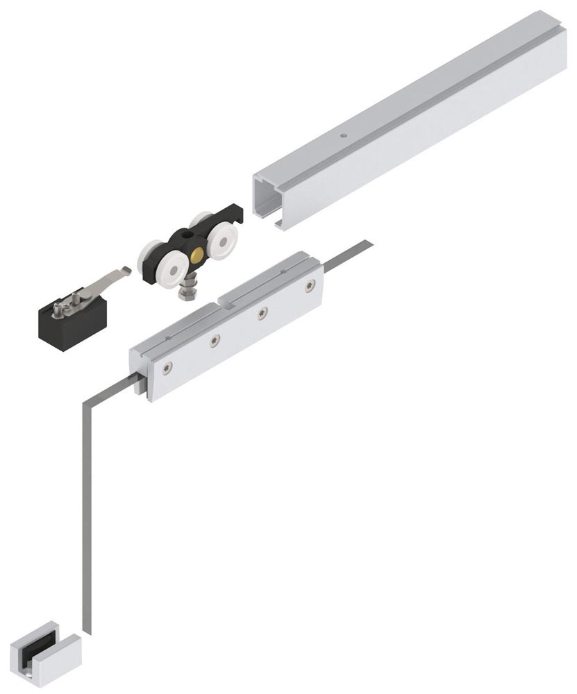 bestehend aus: Komplettset und Laufschiene · für einflügelige Glasschiebetüren bis 140 kg Flügelgewicht und 8 und 10 mm Glasstärke (ESG) · Rollapparate mit Kugellager und Tragschraube aus Edelstahl-Rostfrei, M8 x 45 mm