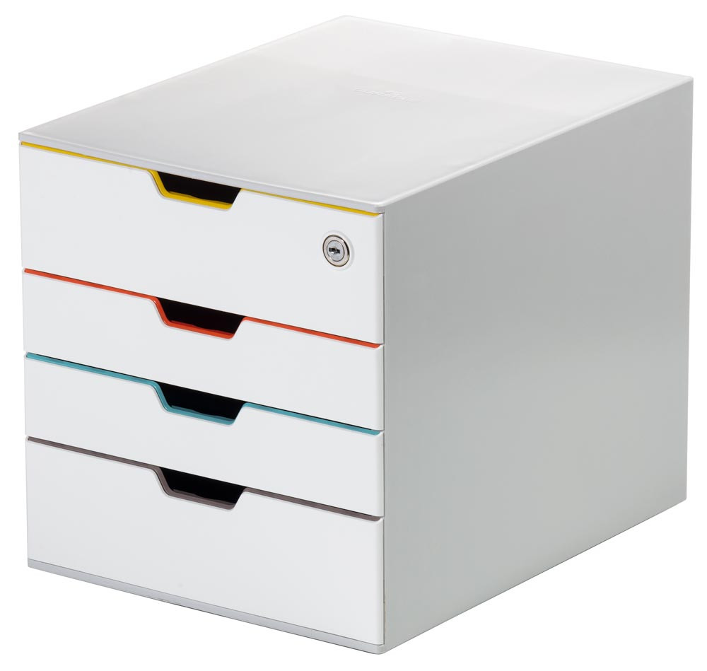 Schubladenbox, BxTxH 280x356x292 mm, 4 farbige Schubladen, aus ABS, inkl. Beschriftungsfenster, abschließbar