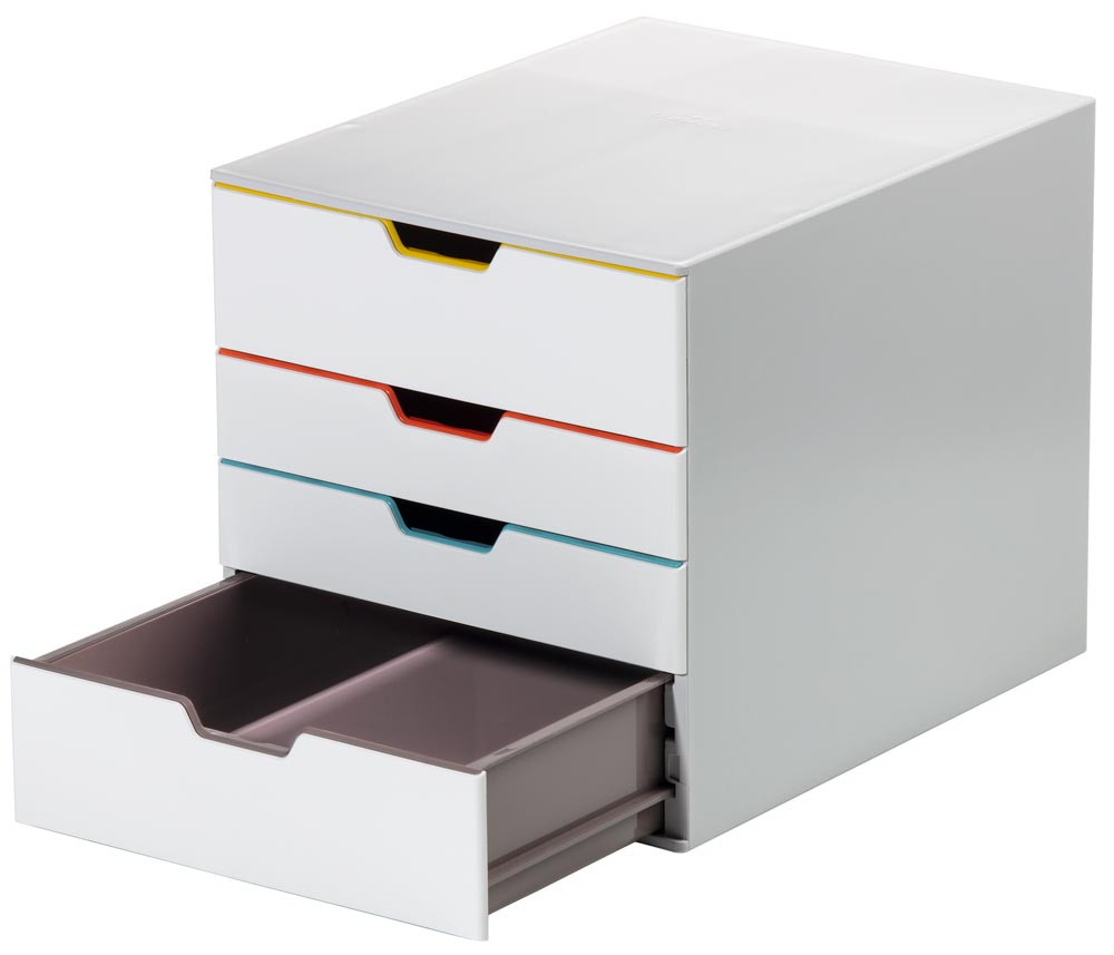 ∙ Schubladenbox mit 4 farbigen Schubladen als Organisations- und Orientierungshilfe ∙ 2 XXL-Schubladen bieten besonderes viel Stauraum ∙ Hochwertige ABS- & PS-Qualität ∙ Geräuschfreier Schubladenlauf, mit Auszugssperre ∙ Für Formate bis DIN A4, C4 sowie Folio- und Letter-Size-Format ∙ Mit transparenten Beschriftungsfenstern und auswechselbaren Einsteck-Etiketten ∙ Stapelbar über rutschfeste Kunststoff-Füßchen ∙ Reihenaufstellung in allen Standard-Büroschränken und Sideboards möglich · Farbe off white