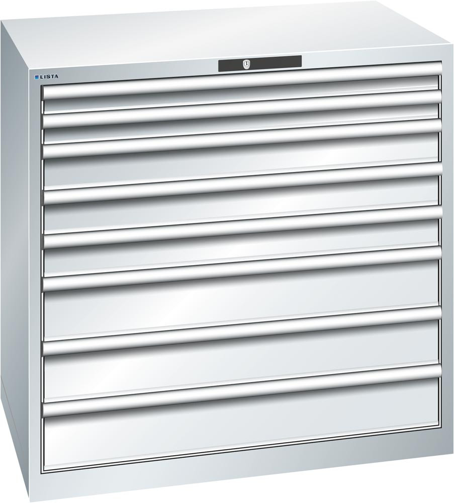 Schubladenschrank, Traglast/Schubl.: 200 kg, 8 Schubladen 2x75, 3x100, 3x150 mm, Zylinderschloss, BxTxH 1023x725x1000 mm, RAL 5012 EP525980