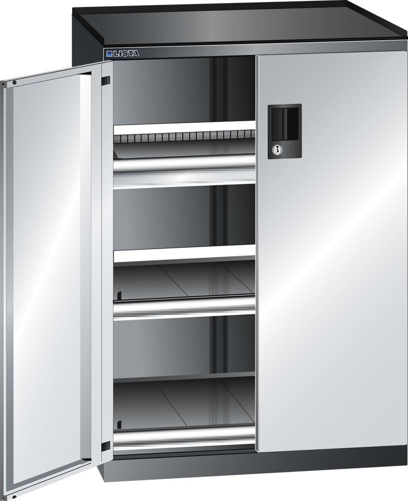 ∙ Aus hochwertigem, pulverbeschichtetem Stahlblech ∙ Flügeltüren, einschlagend aus einem Stück gekantet, Öffnungswinkel 235° schließen bündig mit dem Gehäuse ab ∙ Inneneinrichtung im 25 mm Raster in der Höhe verstellbar ∙ Mit Zylinderschloss