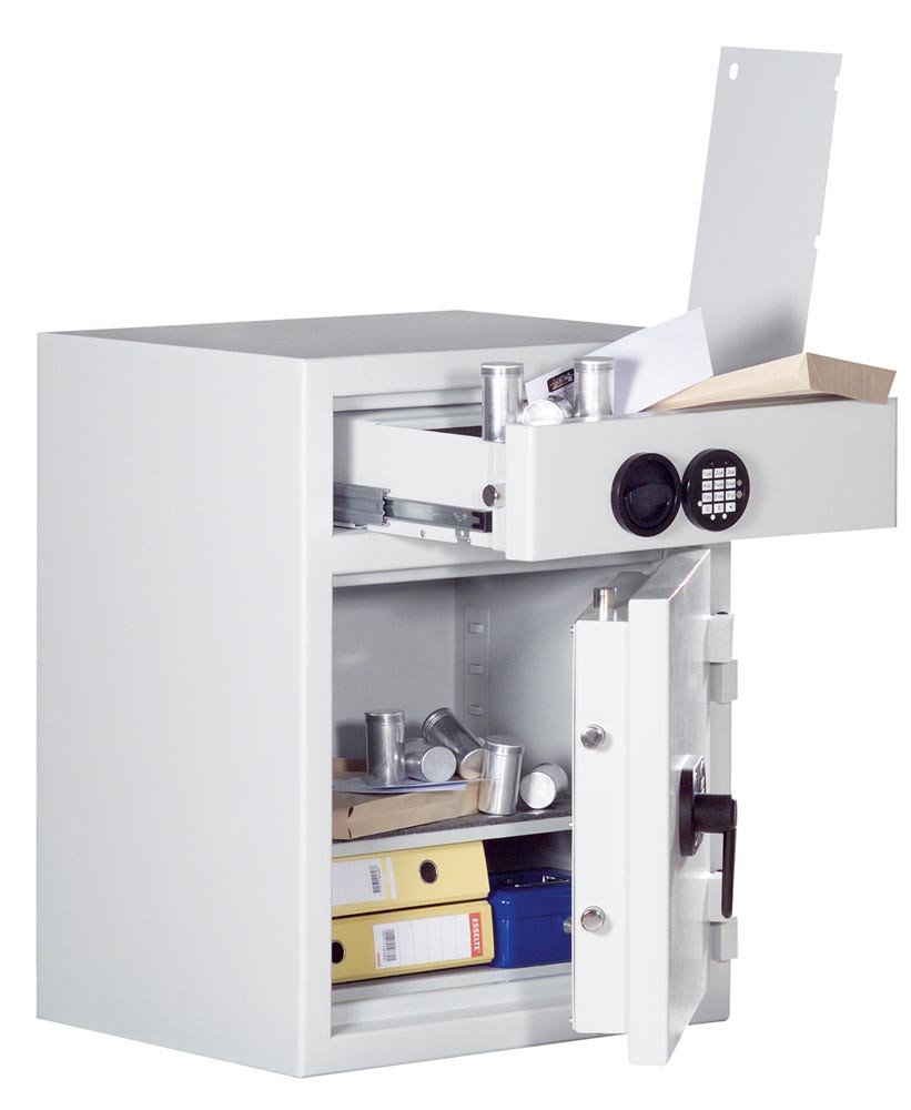 ∙ Freistehende Ausführung, Schutz gegen leichte Brände ∙ Allseitig mehrwandiger Korpus, Tür mehrwandig 104 mm stark ∙ Türbeschlag mit Hängegriff 60 mm vorstehend ∙ Mehrwandige, gepanzerte Schublade 200 mm hoch auf Teleskopschienen ∙ Beim Schließen der Schublade fällt das eingelegte Material in den Tresor, eine Rückholsicherung verhindert die nochmalige Entnahme · 1 Fachboden ∙ Doppelbart-Sicherheitsschloss inklusive zwei Schlüsseln ∙ Lackierung in RAL 7035 lichtgrau