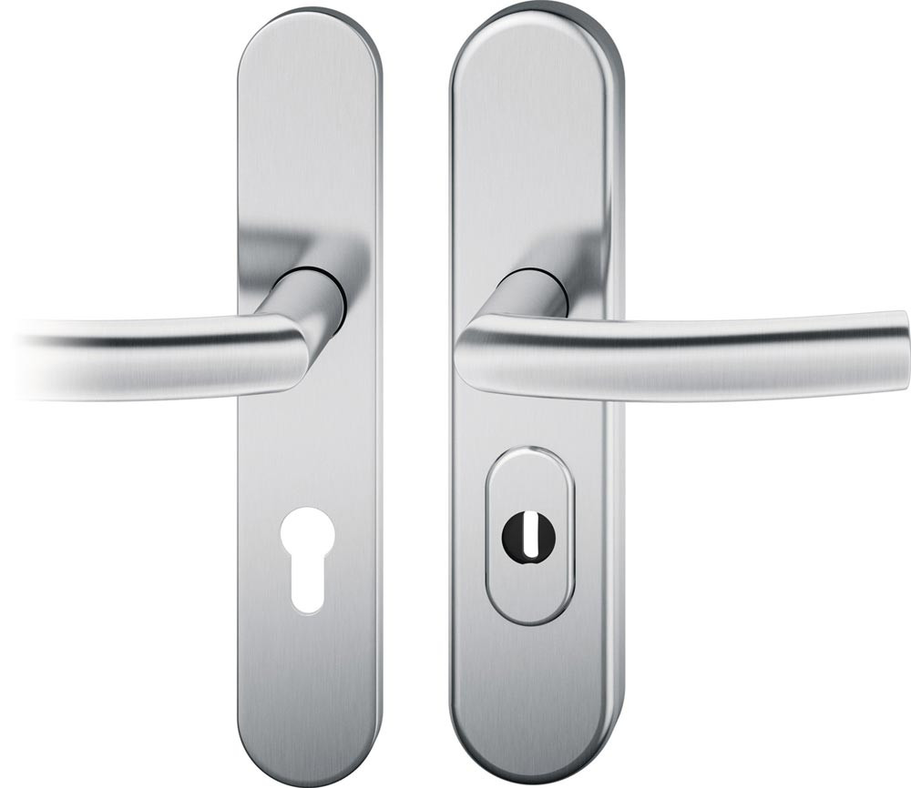 Langschild-Garnitur · für Außentüren · geprüft nach DIN 18257 · außen gekröpfter runder Flachknopf · innen Türgriff fest/drehbar gelagert · Drückerausführung FSB 1107 · verdeckte, durchgehende Befestigung · Lochung PZ, mit Zylinderabdeckung · Türstärke 67-69 mm · DIN links / rechts · Widerstandsklasse ES 1
