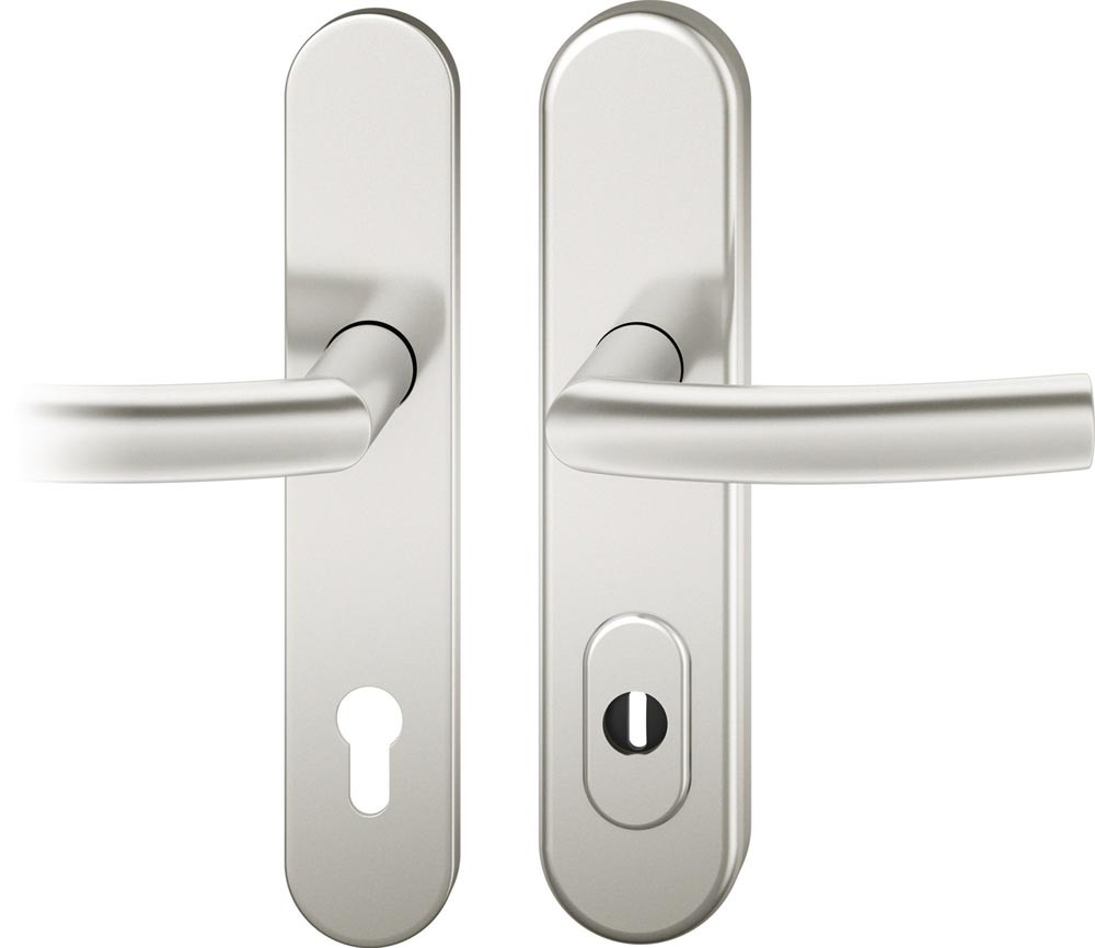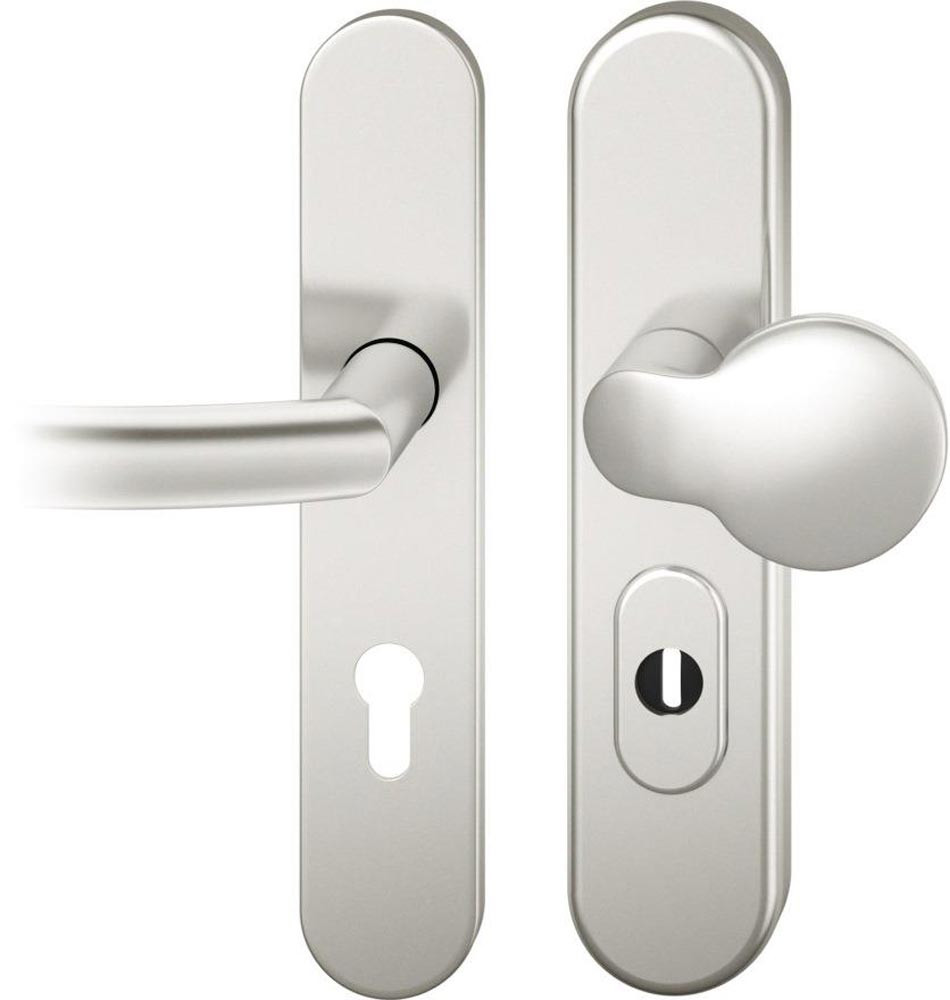 Langschild-Garnitur · für Außentüren · geprüft nach DIN 18257 · außen gekröpfter runder Flachknopf · innen Türgriff fest/drehbar gelagert · Drückerausführung FSB 1107 · verdeckte, durchgehende Befestigung · Lochung PZ, mit Zylinderabdeckung · Türstärke 67-69 mm · DIN links / rechts · Widerstandsklasse ES 1