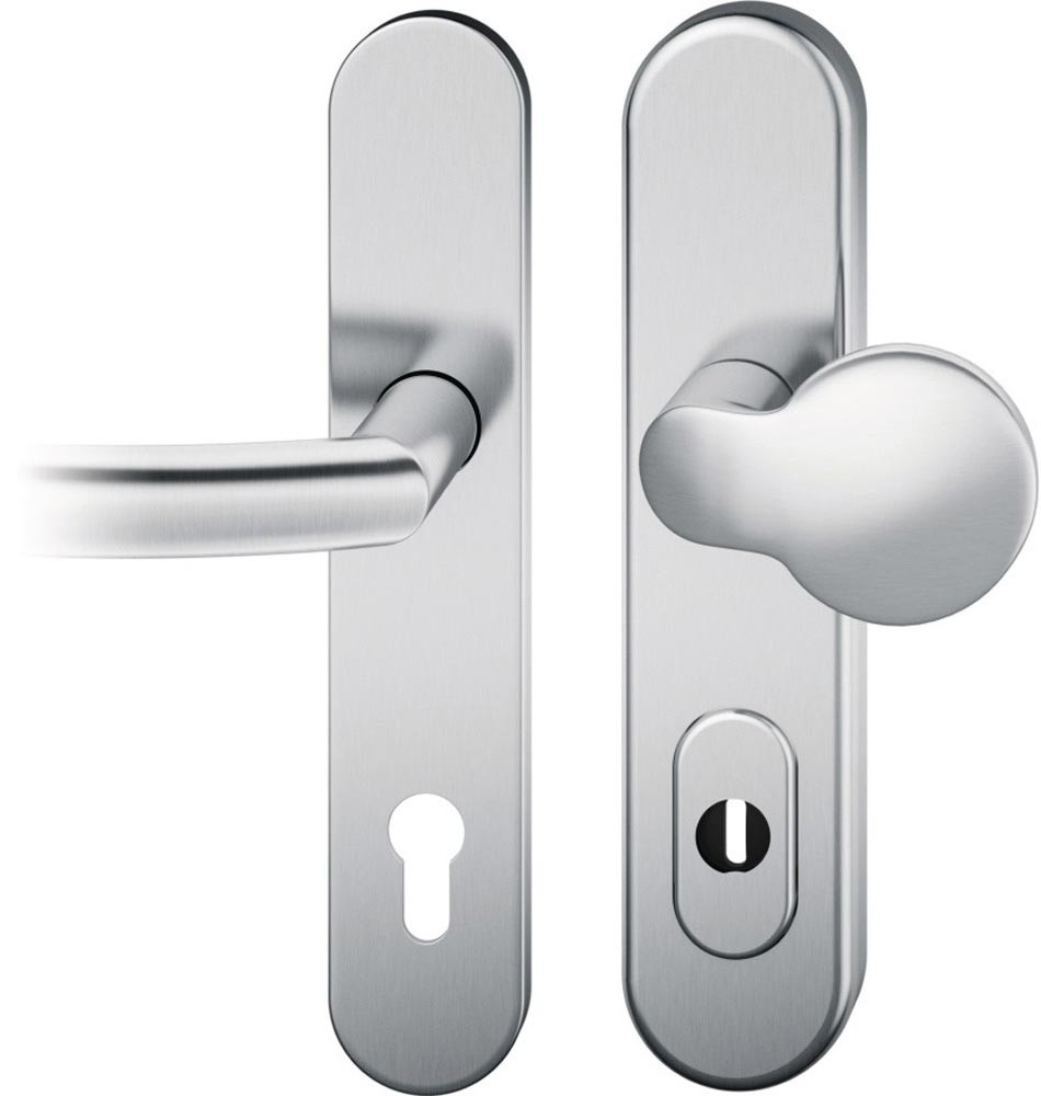 Langschild-Garnitur · für Außentüren · geprüft nach DIN 18257 · außen gekröpfter runder Flachknopf · innen Türgriff fest/drehbar gelagert · Drückerausführung FSB 1107 · verdeckte, durchgehende Befestigung · Lochung PZ, mit Zylinderabdeckung · Türstärke 67-69 mm · DIN links / rechts · Widerstandsklasse ES 1