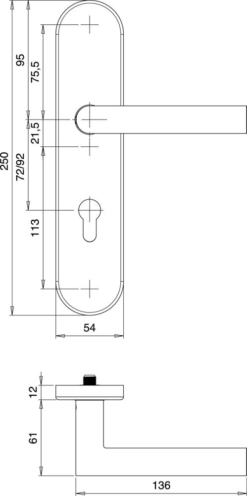 Grundkonstruktion: Druckguss mit 2 mm Teilstahleinlage im Außenschild, oberflächengehärtet · Stärke Innenschild = 8 mm · Drücker-Lagerung: lose · Drückertyp und -stärke: 108 mit Ø 22 mm · Knopfausführung bei Wechselgarnitur: Modell …/0272 und …/0292 = K2 (gekröpft), bzw. Modell …/0772 und …/0792 = K7 (gerade) · Stütznocken: M6, Ø 10 mm anbohrgeschützt · Verschraubung: 3-fach M6, verdeckt · Anbohrschutz beim Außenschild · Wechselgarnituren mit Spezialrollenwechselstift mit M12-Gewinde · DIN links / rechts · ohne Zylinderabdeckung · Widerstandsklasse ES1
