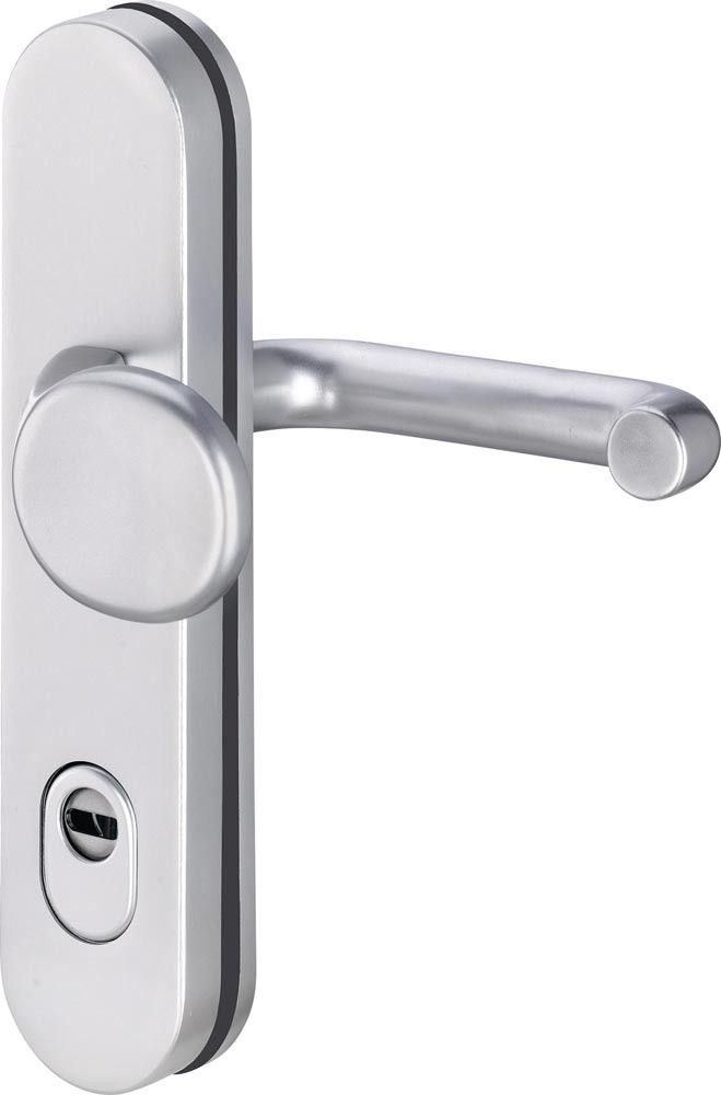 Grundkonstruktion: Druckguss mit 2 mm Teilstahleinlage im Außenschild, oberflächengehärtet · Stärke Innenschild = 8 mm · Drücker-Lagerung: lose · Drückertyp und -stärke: 103 mit Ø 22 mm, bzw. bei Alu 8 mm VKT = 104 mit Ø 18 mm · Knopfausführung bei Wechselgarnitur: Modell …/0272 und …/0292 = K2 (gekröpft), bzw. Modell …/0772 und …/0792 = K7 (gerade) · Stütznocken: M6, Ø 10 mm anbohrgeschützt · Verschraubung: 3-fach M6, verdeckt · Anbohrschutz beim Außenschild · Wechselgarnituren mit Spezialrollenwechselstift mit M12-Gewinde · mit Zylinderabdeckung: federnd gelagert für 12 - 17 mm Überstand · DIN links / rechts · Widerstandsklasse ES1