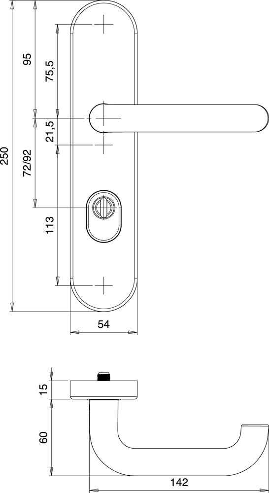 Grundkonstruktion: Druckguss mit 2 mm Teilstahleinlage im Außenschild, oberflächengehärtet · Stärke Innenschild = 8 mm · Drücker-Lagerung: lose · Drückertyp und -stärke: 103 mit Ø 22 mm, bzw. bei Alu 8 mm VKT = 104 mit Ø 18 mm · Knopfausführung bei Wechselgarnitur: Modell …/0272 und …/0292 = K2 (gekröpft), bzw. Modell …/0772 und …/0792 = K7 (gerade) · Stütznocken: M6, Ø 10 mm anbohrgeschützt · Verschraubung: 3-fach M6, verdeckt · Anbohrschutz beim Außenschild · Wechselgarnituren mit Spezialrollenwechselstift mit M12-Gewinde · mit Zylinderabdeckung: federnd gelagert für 12 - 17 mm Überstand · DIN links / rechts · Widerstandsklasse ES1