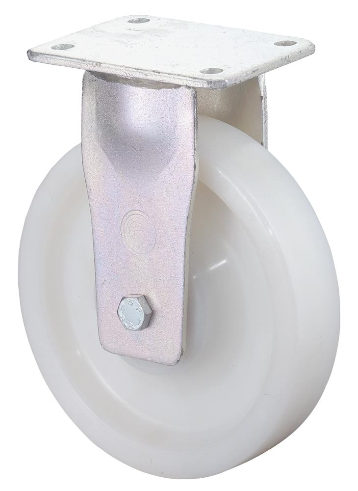 schwere Stahlschweißkonstruktion · verzinkt · Rad aus Kunststoff (naturfarben) · Kugellager · bruchsicher und sehr abriebfest · weitgehend beständig gegen Benzin, Diesel, Öle sowie pflanzliche und tierische Fette · mit Plattenbefestigung