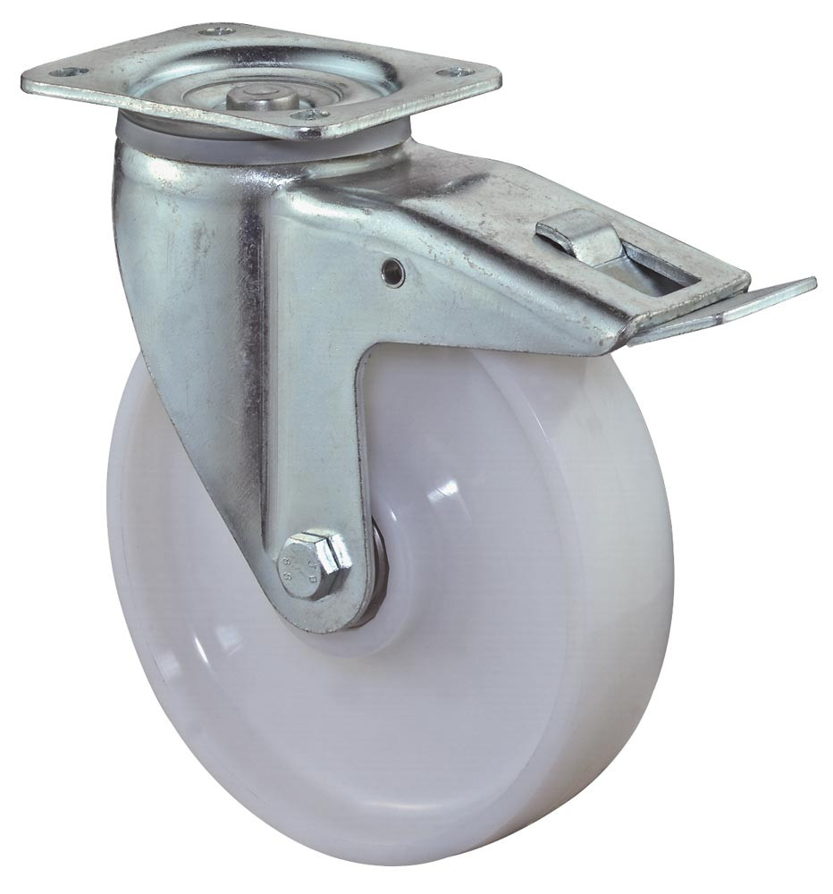 schwere Transportgeräterolle mit Totalfeststeller · Kugellager · Gabel aus Stahlblech, verzinkt chromatiert · zweireihiger Kugelkranz im Gabelkopf · Radachse verschraubt · Radkörper aus Kunststoff, Lauffläche aus Kunststoff · bruchsicher und sehr abriebfest · mit Plattenbefestigung