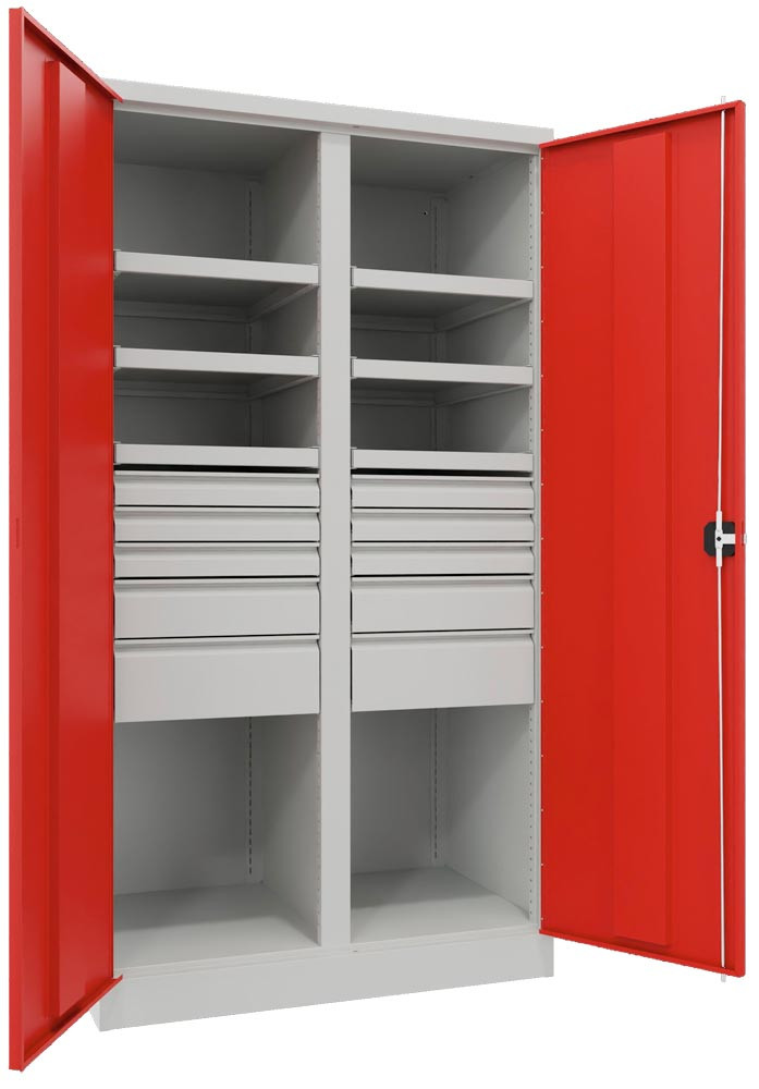 Schwerlastschrank, Vollblechtüren, ohne Trennwand, 3 Böden, 200 kg Traglast, 2 Schubl. 175 mm, BxTxH 1040x630x1950 mm, RAL 5010 EP562207