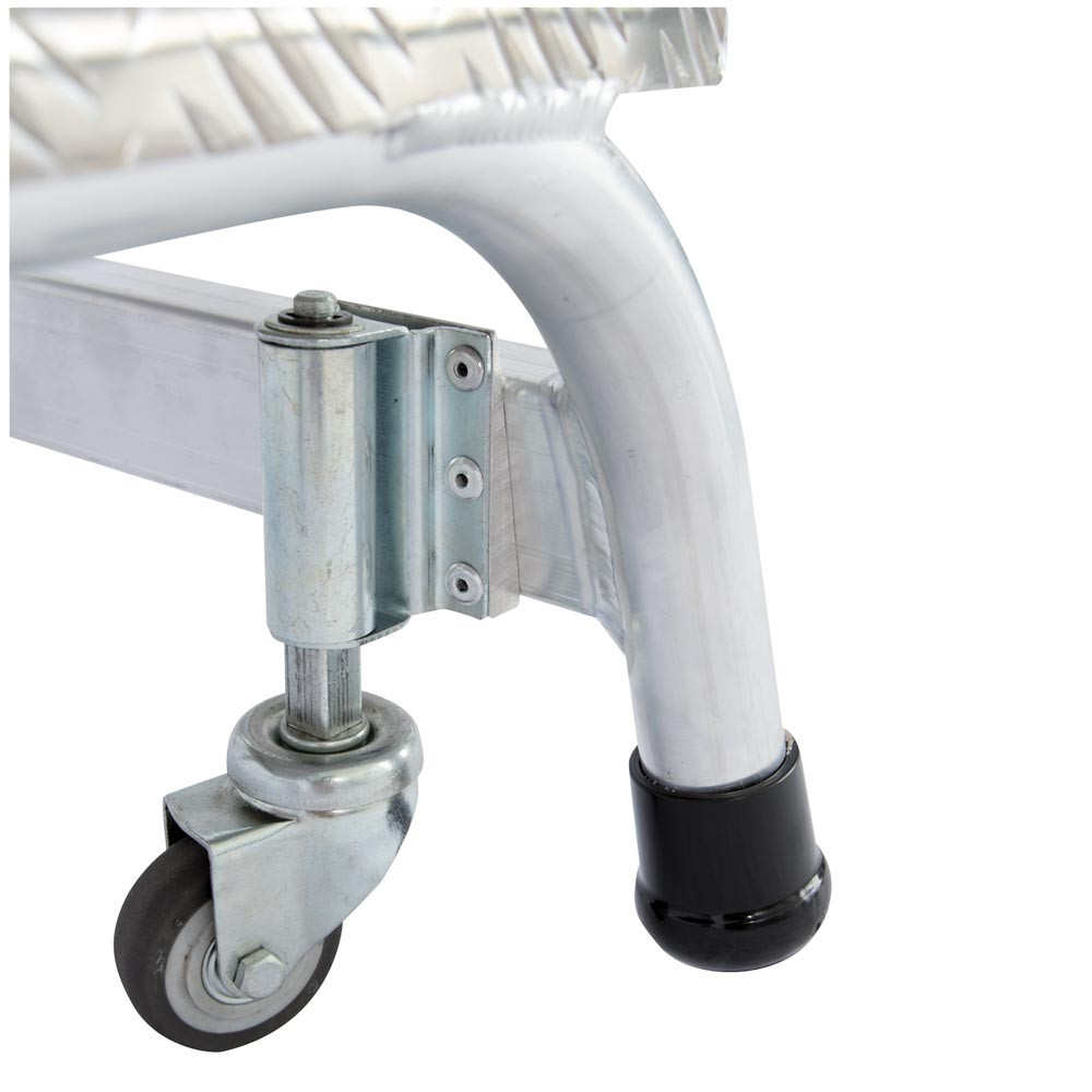 ∙ Stabile, verschweißte Rohrkonstruktion aus Aluminium ∙ Fahrbar ∙ 360° drehbar ∙ 240 mm tiefe Stufen ∙ Vier versenkbare Lenkrollen ∙ Kniehoher Sicherheitsbügel ∙ Obere Standfläche B x T 520 x 305 mm ∙ Breite, stabile Quertraverse mit rutschsicheren Fußkappen und integrierten Transportrollen