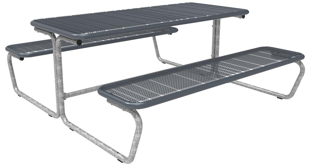 ∙ Stahlrohrrahmen feuerverzinkt ∙ Rohr-Ø 38 mm ∙ Sitzfläche aus Drahtgitter ∙ Tischplatte aus Drahtgitter ∙ Drahtstärke 3,2 mm ∙ Raster 15 x 15 mm ∙ Isolierte Beschichtung mind. 350 μm ∙ Mobile Ausführung mit Gleitschienen und standardmäßig 8 Bohrungen mit Ø 11 mm zum möglichen