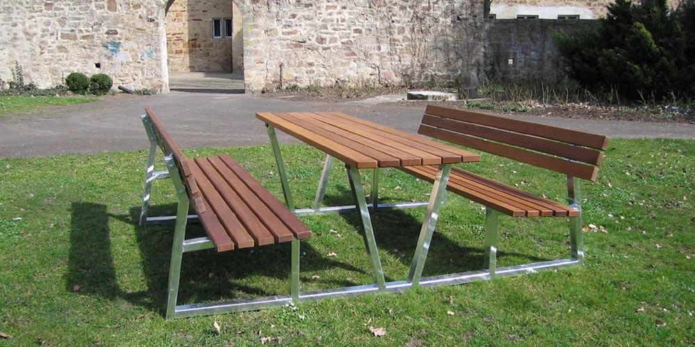 Sitzplatzgarnitur mit Rechteck-Stahlrohr-Füssen, 2 Bänke+Tisch, feuerverzinkt, Länge 2 m, Latten aus Nordischer Fichte