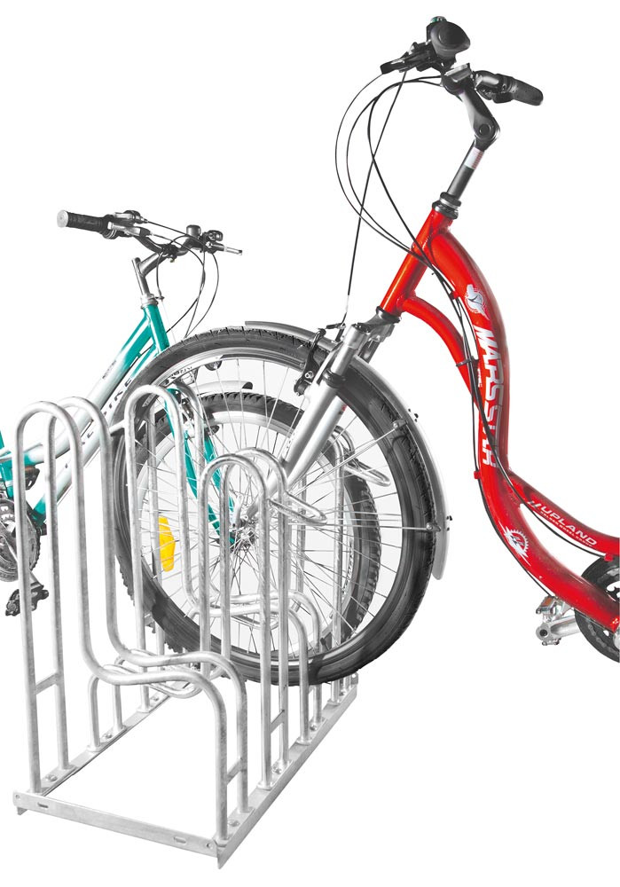 ∙ Komplett aus Stahl feuerverzinkt ∙ Abwechselnde Hoch-Tiefstellung im Winkel von 90° ∙ Haltebügel aus Ø 18 mm Rohr ∙ Haltebügel für Reifenbreite bis 55 mm, auch für Mountainbikes geeignet ∙ Grundrahmen aus Winkeleisen 30 x 30 mm ∙ Schnelle Selbstmontage ∙ Vorbereitet zur Reihenverbindung und Bodenbefestigung