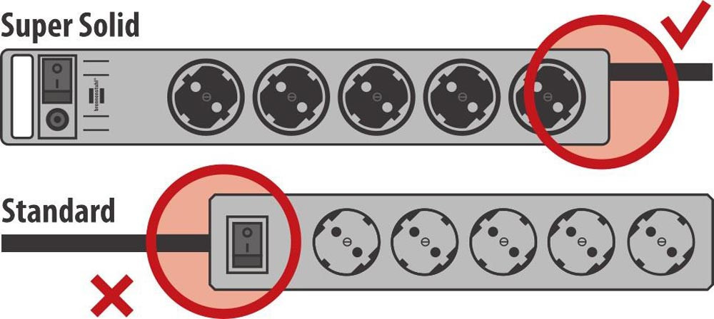 schützt wertvolle elektrische Geräte vor gefährlicher Überspannung · sehr stabil konstruierte Steckdosenleiste aus hochbruchfestem Polycarbonat · Sicherheitsschalter beleuchtet, 2-polig ein-/ausschaltbar · Schutzkontaktsteckdosen in 45°-Anordnung, auch für Winkelstecker · die Abstände ermöglichen den Betrieb von Netzgeräten · mit Aufhängevorrichtung, sehr gut anschraubbar durch Schraubführungen · mit Kinderschutz · Sichungsautomat 16 A · Länge der Steckdosenleiste = 63 cm