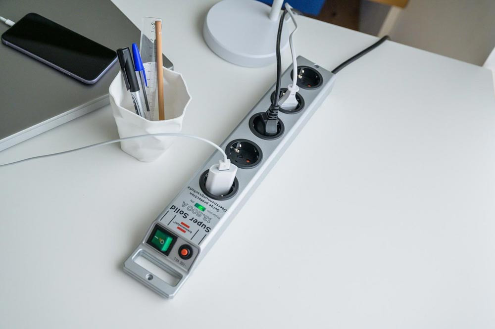 schützt wertvolle elektrische Geräte vor gefährlicher Überspannung · sehr stabil konstruierte Steckdosenleiste aus hochbruchfestem Polycarbonat · Sicherheitsschalter beleuchtet, 2-polig ein-/ausschaltbar · Schutzkontaktsteckdosen in 45°-Anordnung, auch für Winkelstecker · die Abstände ermöglichen den Betrieb von Netzgeräten · mit Aufhängevorrichtung, sehr gut anschraubbar durch Schraubführungen · mit Kinderschutz · Sichungsautomat 16 A · Länge der Steckdosenleiste = 45 cm