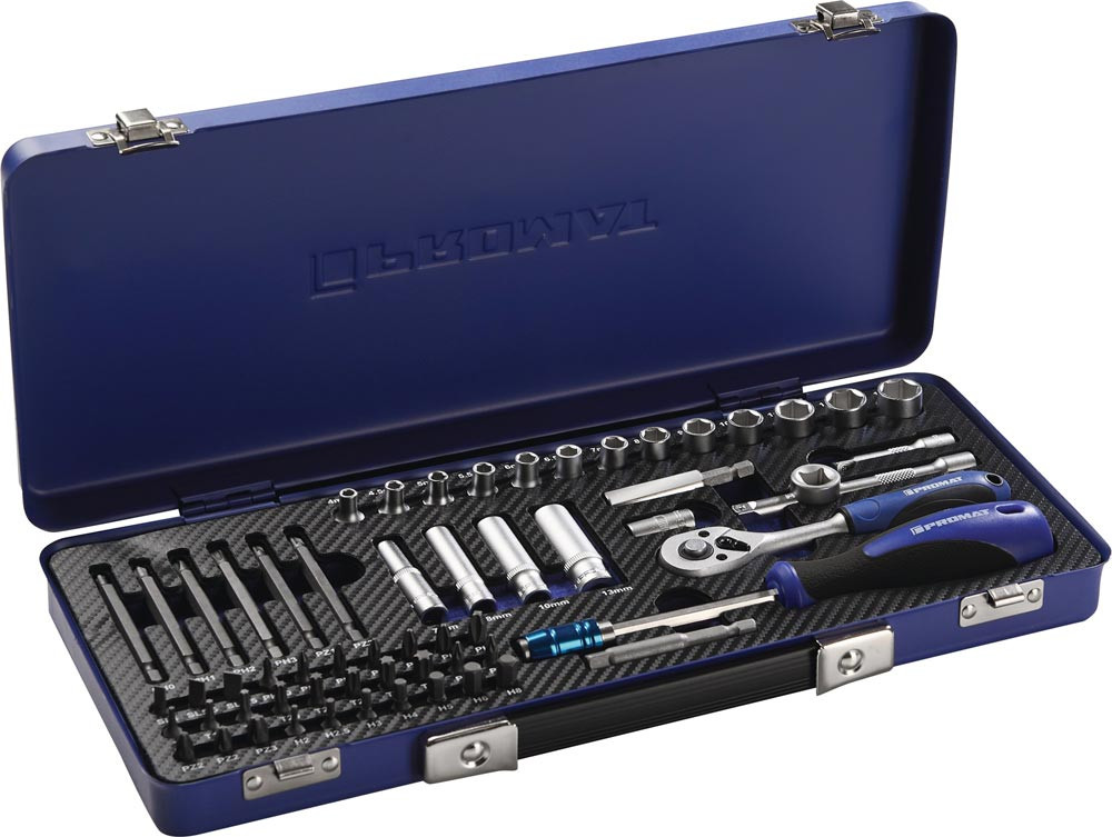 6,3 mm (1/4 ″)-Vierkantantrieb · Steckschlüssel-Einsätze und Bedienelemente aus Chrom-Vanadium-Stahl · matt verchromt · Steckschlüssel-Einsätze mit griffiger Rändelung · Schraubeinsätze aus S2-Stahl · Hebel-Umschaltknarre mit 2-Komponenten-Griff und Nussverriegelungsfunktion mit Druckknopfauslösung · zweifarbige Einlage zur einfachen Werkzeug-Vollzähligkeitskontrolle