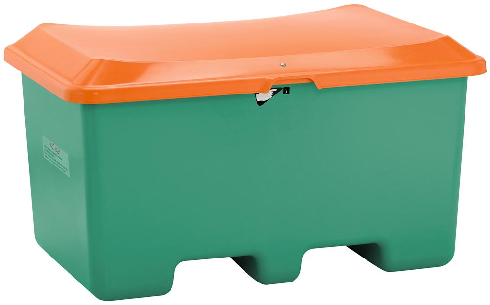 ∙ Für freistehende Aufstellung an allen Orten, wo sofortiger Einsatz von trockenem Streugut erforderlich ist ∙ Behälter aus glasfaserverstärktem Kunststoff GFK ∙ Seit Jahrzehnten bewährt ∙ Selbsttätig sichernder Schlosshaken aus Edelstahl ∙ Ab 400 l mit Stützstab für Deckel ∙ Deckelfarbe orange