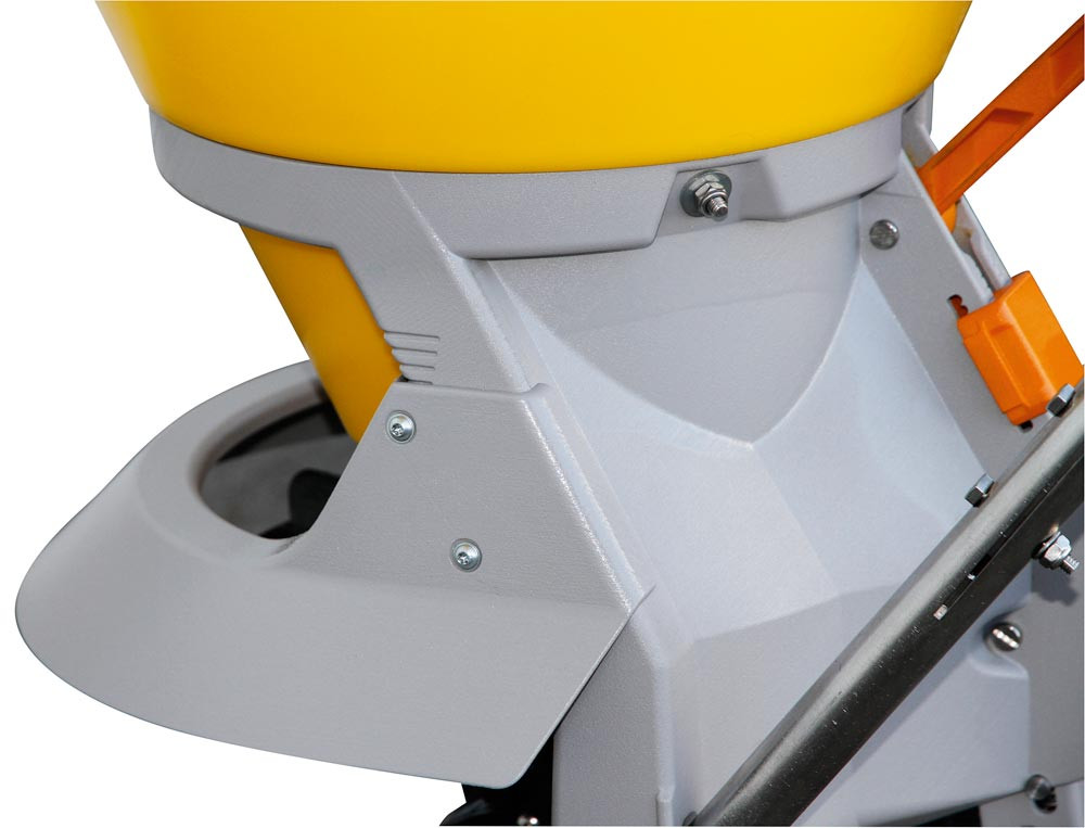 Composite-Rahmen · Kunststoffbehälter, gelb · Gummiräder luftbereift mit Winterprofil · mit klappbarem Ständerfuß · für mittlere Streuflächen · Streubreite 1-4 m · 6 Streustufen mit Streumengenregler · Lieferung erfolgt vormontiert