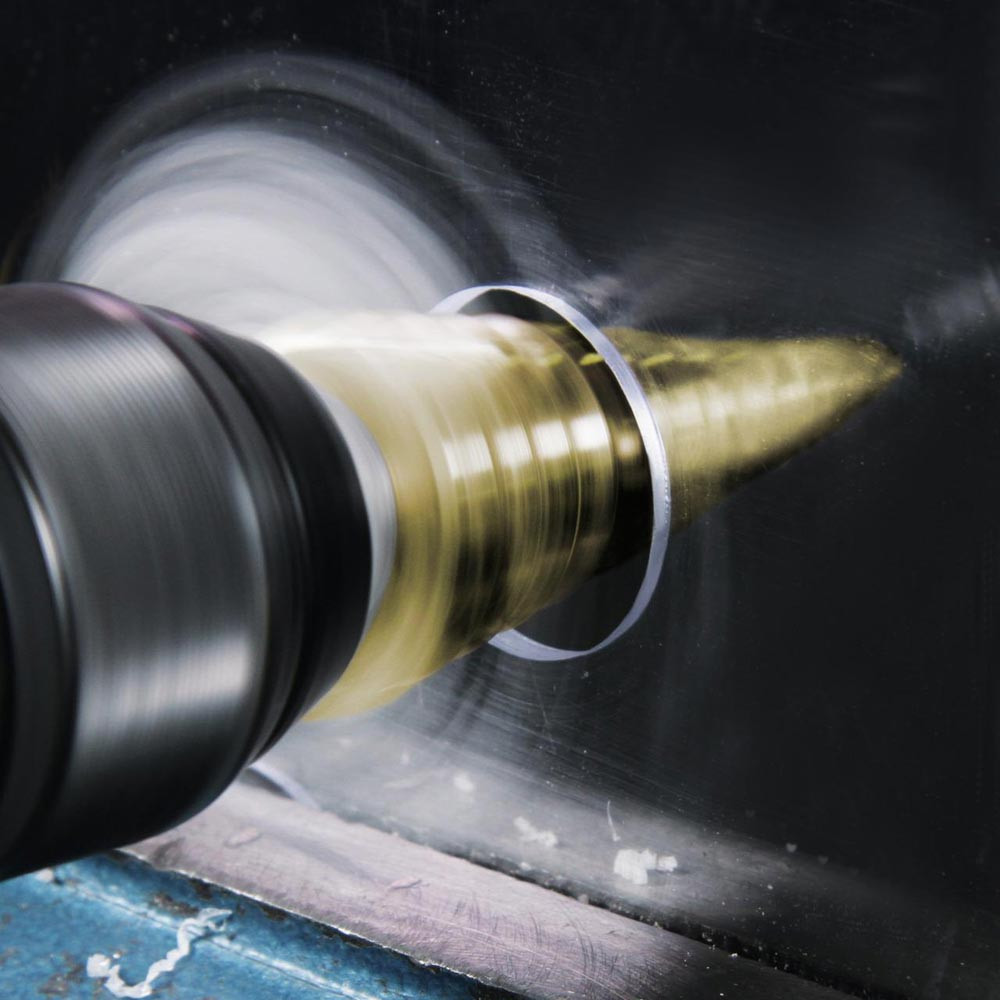Die tiefgeschliffene und spiralförmige Spannut bietet absolute Laufruhe und hohe Schnittleistung. Insbesondere nicht brechende Späne werden wie bei einem Spiralbohrer sauber abtransportiert. Dies vermindert die Bildung von Aufbauschneiden und Kaltverschweißungen an den Schneiden. Der Konus erleichtert das Zurückziehen bei durchgebohrten Blechen.