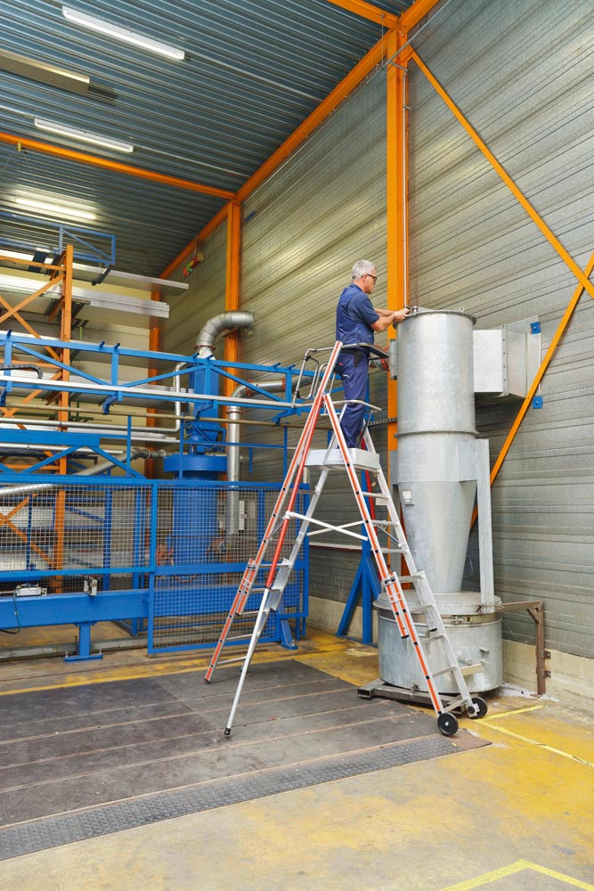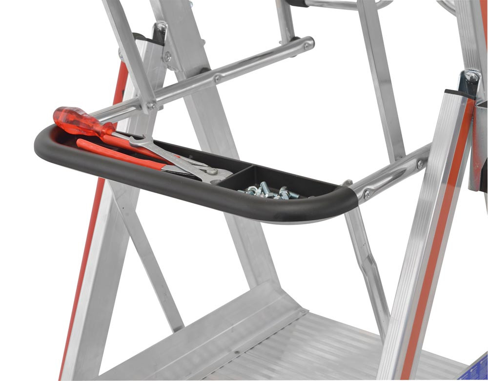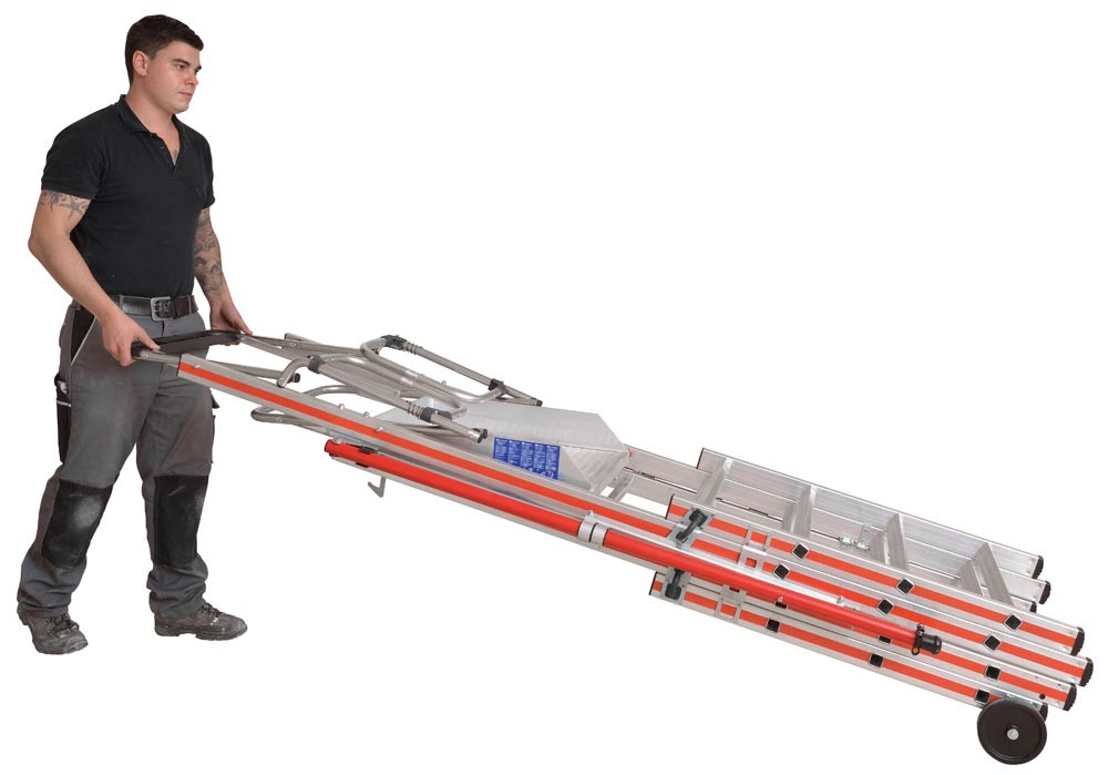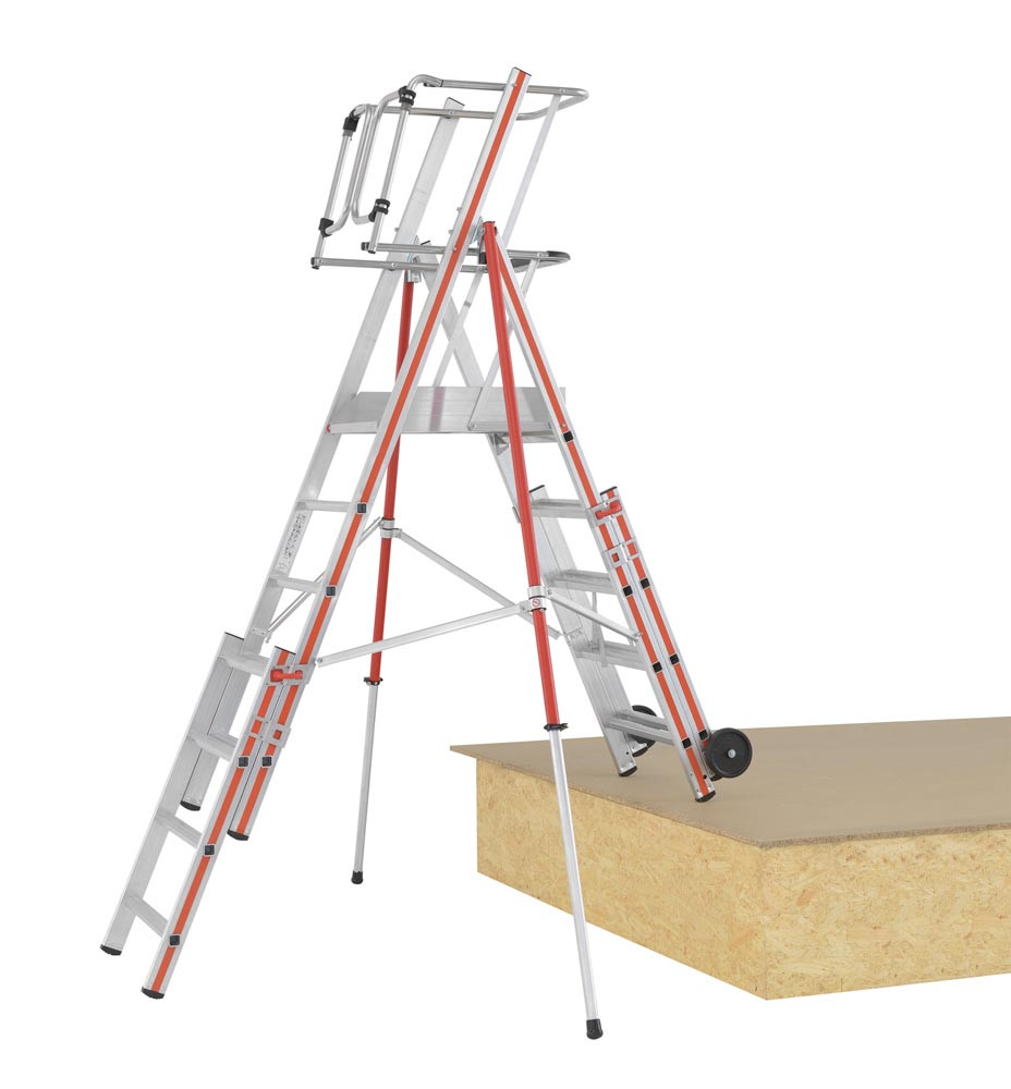 ∙ Funktionelle Ablageschale, in 2 Höhen montierbar ∙ Bequemer Aufstieg durch 45 mm tiefe Breitsprossen ∙ Mit teleskopierbaren Leiterteilen zur Höhenverstellung im Sprossenabstand · Zulässige Belastung 150 kg · Entspricht EN 131-7 und NF P 93-352/353