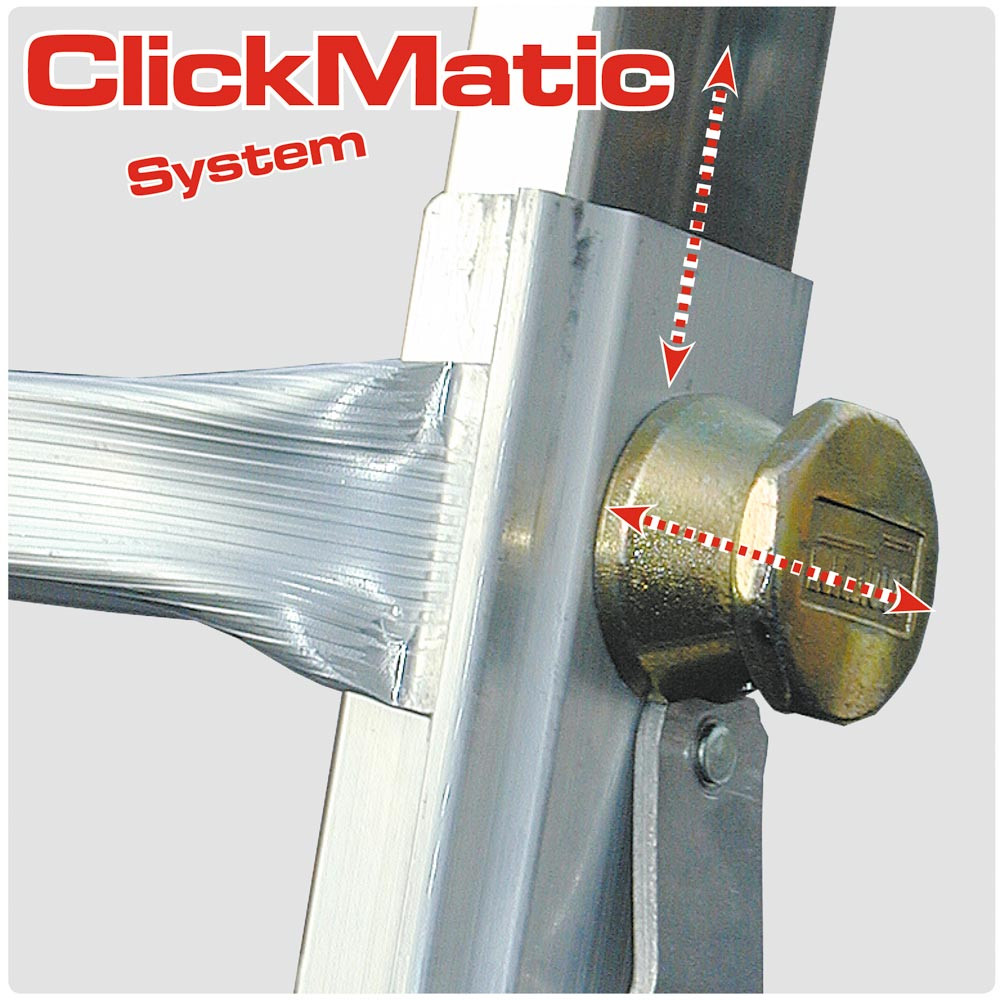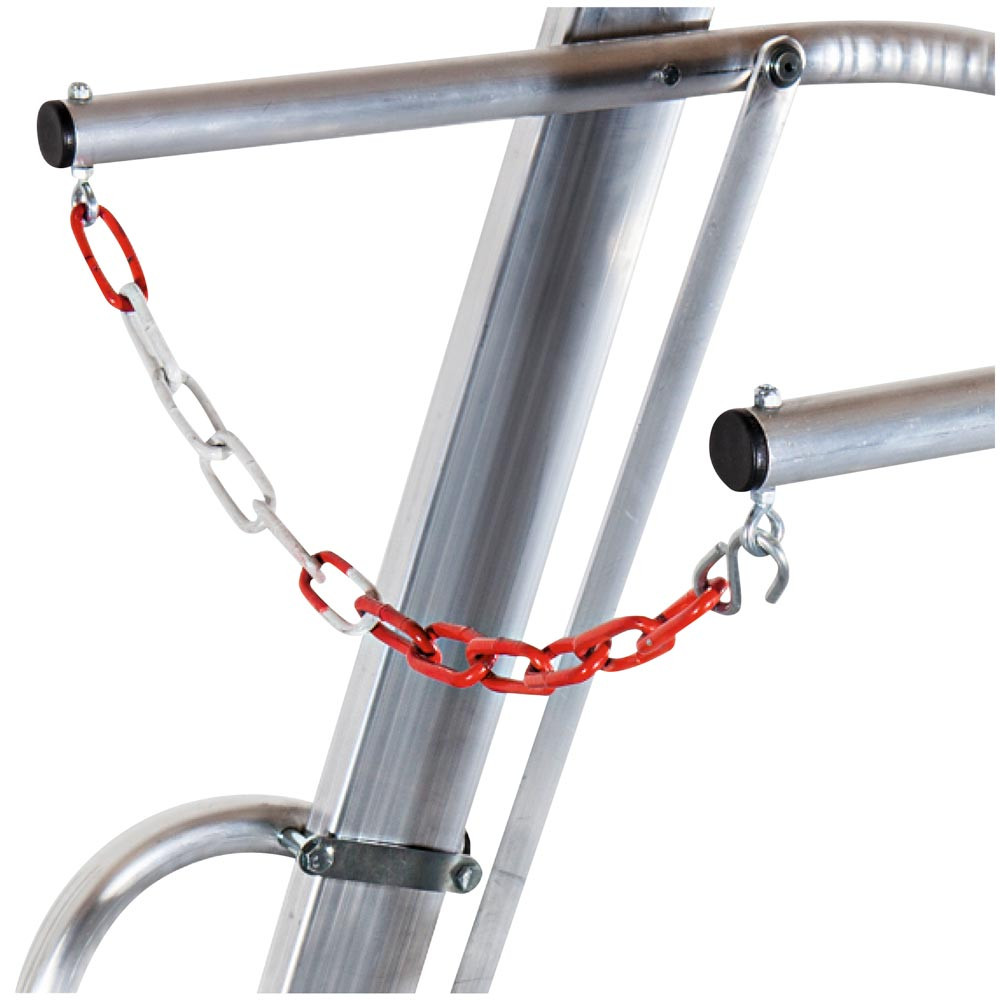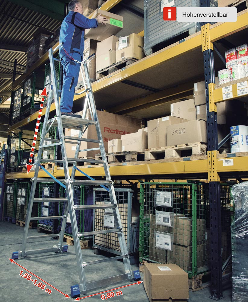 · Leicht höhenverstellbar · Große Standplattform 500 x 450 mm ∙ Stabile Quertraverse mit integrierten Fahrrollen für einen sicheren Stand und leichten Transport der Leiter ∙ Hohe Stabilität durch Zug- und Drucksicherungen ∙ Sicherungsbügel mit Kette ∙ Entspricht EN 131
