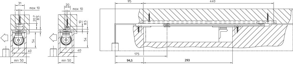 integrierter Türschließer · verdeckt liegend · für Anschlagtüren ab 40/50 mm Türblattstärke, nach EN 1154 A · im eingebauten Zustand verstellbare Schließkraft, Schließgeschwindigkeit, Öffnungsdämpfung und Endschlag · DIN rechts/links verwendbar